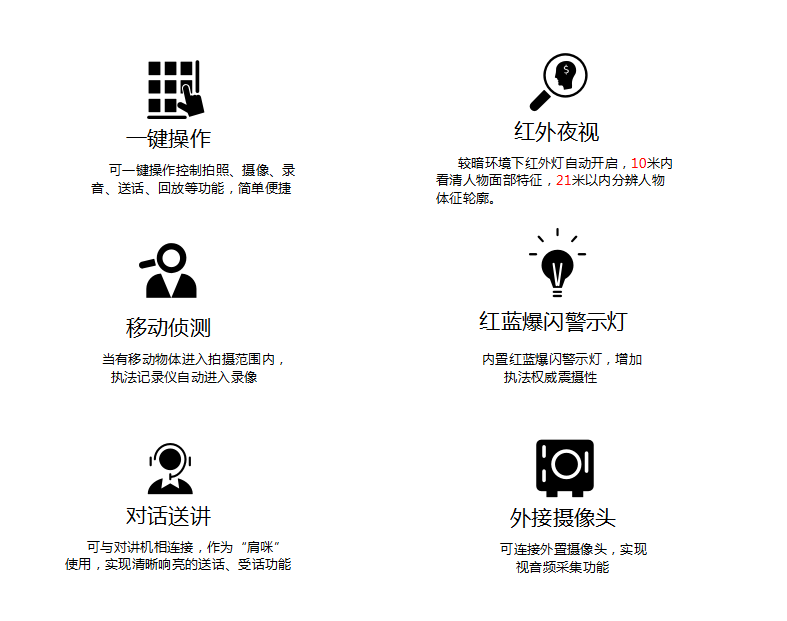威九国际DSJ-200F 执法仪(法院/政府/城管)拍摄像素高达5000万,广角镜头137,拍摄画面精细而全面,大容量电池支持陆续在工作12小时不断电